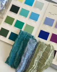 O tecido chega até nós em sua tonalidade natural e passa por um cuidadoso processo de definição de cor, realizado em conjunto com nossa cliente, antes de seguir para o tingimento.
