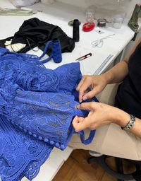 Já a incrustação é um processo manual onde recortamos delicadamente as rendas, aproveitando os desenhos de cada uma. Em seguida, são cuidadosamente posicionadas sobre a base e costuradas à mão resultando em texturas ricas e detalhes sofisticados.